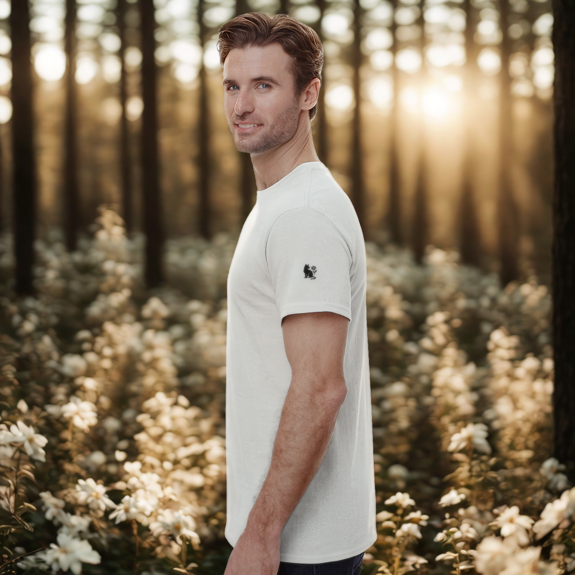A soft, heavyweight unisex T-Shirt featuring a clean black front print of a Cat and forest flower—symbolizing gentleness and resilience. Designed by Varg & Vitsippa in a Scandinavian minimalist style, this T-Shirt merges nature and quiet strength in one timeless piece.